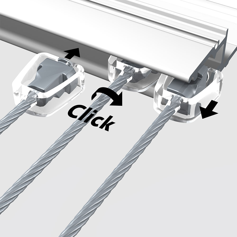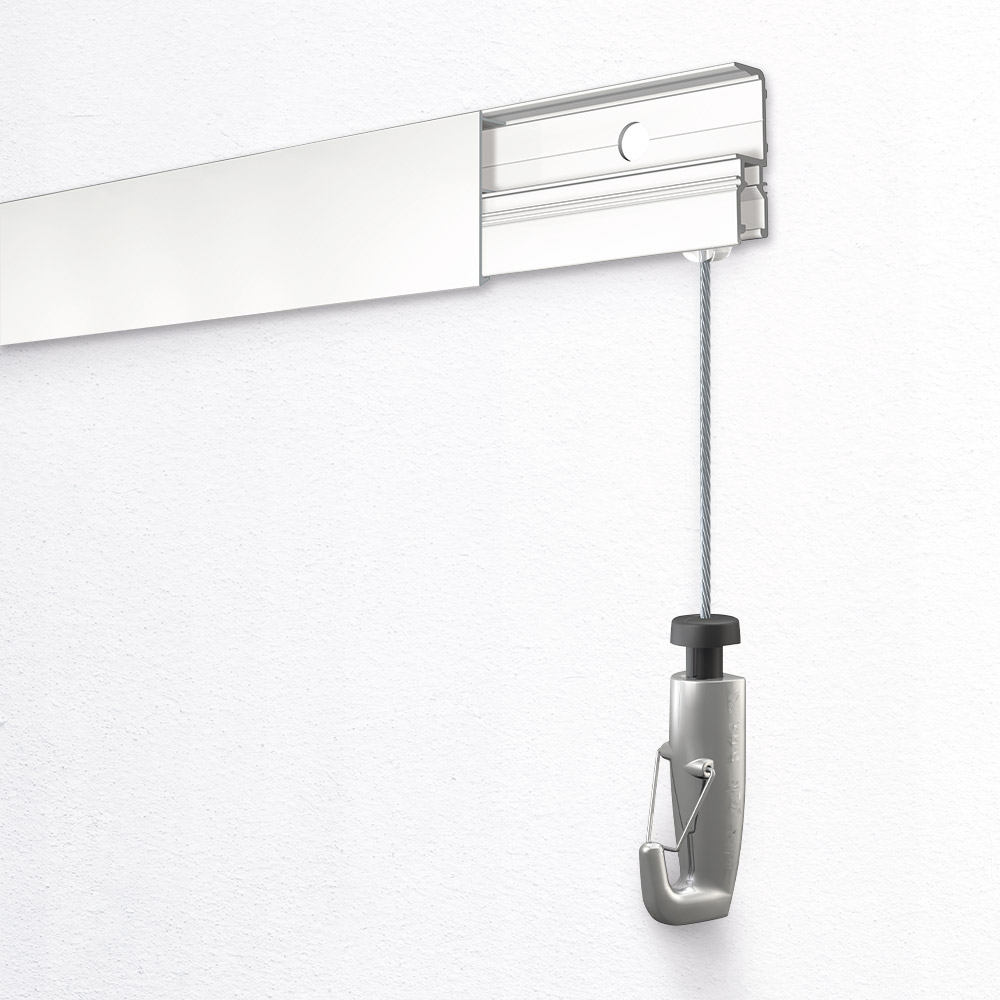 The innovative design features a dual-component design, comprising an aluminium rail paired with a protective cover. Specifically engineered for the secure display of heavy artworks, the R70 Rail is intended to be used with 2.5mm steel cable Twister that securely locks into the rail, along with the 2.5mm Auto Grip Lock Hook for effortless hanging. The multifunctional nature of the R70 Rail also allows for the use of standard 2mm wires and hooks, providing the flexibility to display smaller and lighter artworks with ease.