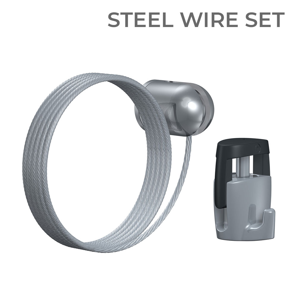 For the 20 kg / 44 lb capacity set, you’ll get a 1.8 mm Steel Hanging Wire, an H100 Hook, and the same sturdy wall hanger components.