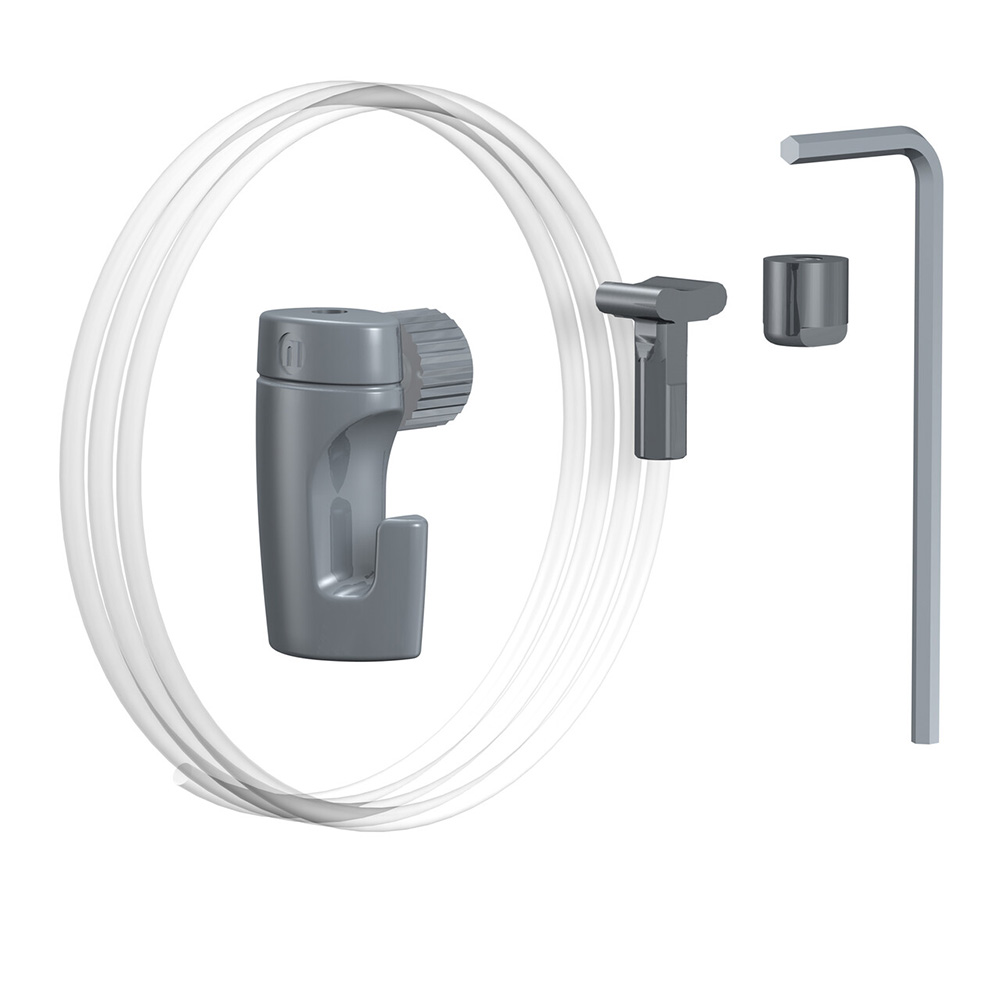 You will receive a 250cm Hanging Cord made of durable 2mm Perlon, a robust H50 Hook with a maximum load capacity of 5 kg / 11 lb, a reliable Stopper, and a handy Allen Key for easy installation.